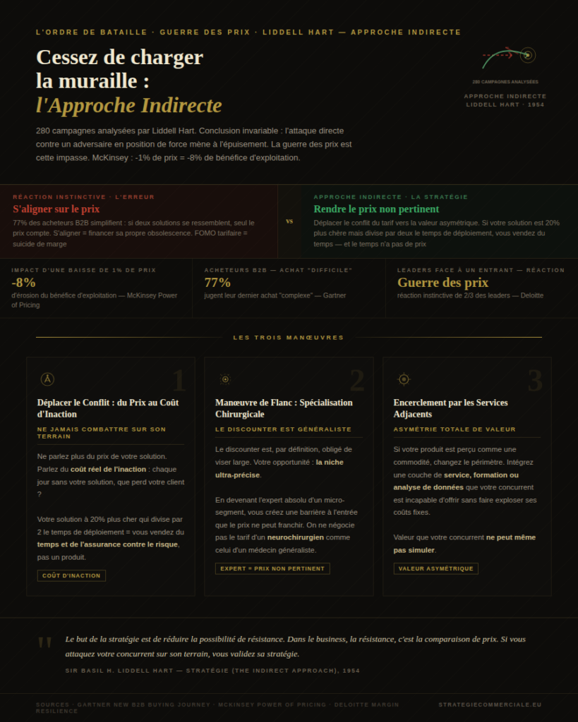 2. […] sur le prix. C’est épuisant, frustrant et peu rentable. Comme l’explique Liddell Hart, entrer dans une guerre des prix est toujours une erreur stratégique — mieux vaut rendre le prix non pertinent en différenciant par la […]