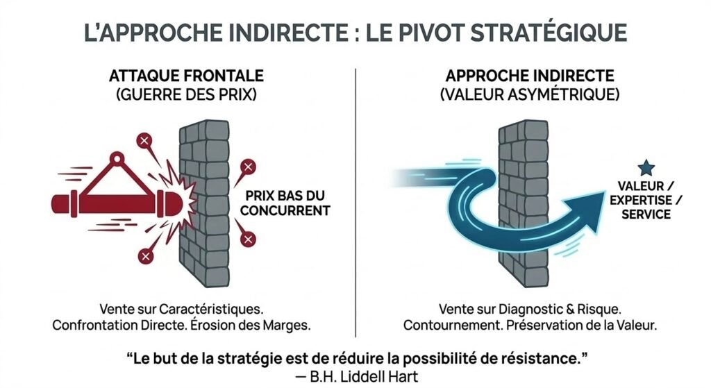 Dans le business, la « résistance », c’est la comparaison de prix. Si vous attaquez votre concurrent sur son terrain (le tarif), vous validez sa stratégie. L’approche indirecte consiste à créer un déséquilibre. Au lieu de charger la muraille, on cherche la faille psychologique ou logistique. On ne bat pas un discounter sur le prix, on le bat en rendant le prix non pertinent.