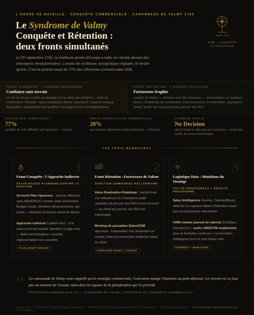 Le miroir de Valmy nous enseigne une vérité brutale : la victoire ne dépend pas de la puissance de feu théorique, mais de la capacité à anticiper la friction et à identifier le véritable centre de gravité adverse. Pour le leader GTM, cela impose une discipline de fer sur deux fronts simultanés : la conquête commerciale de nouveaux territoires et la fortification de ses propres acquis.